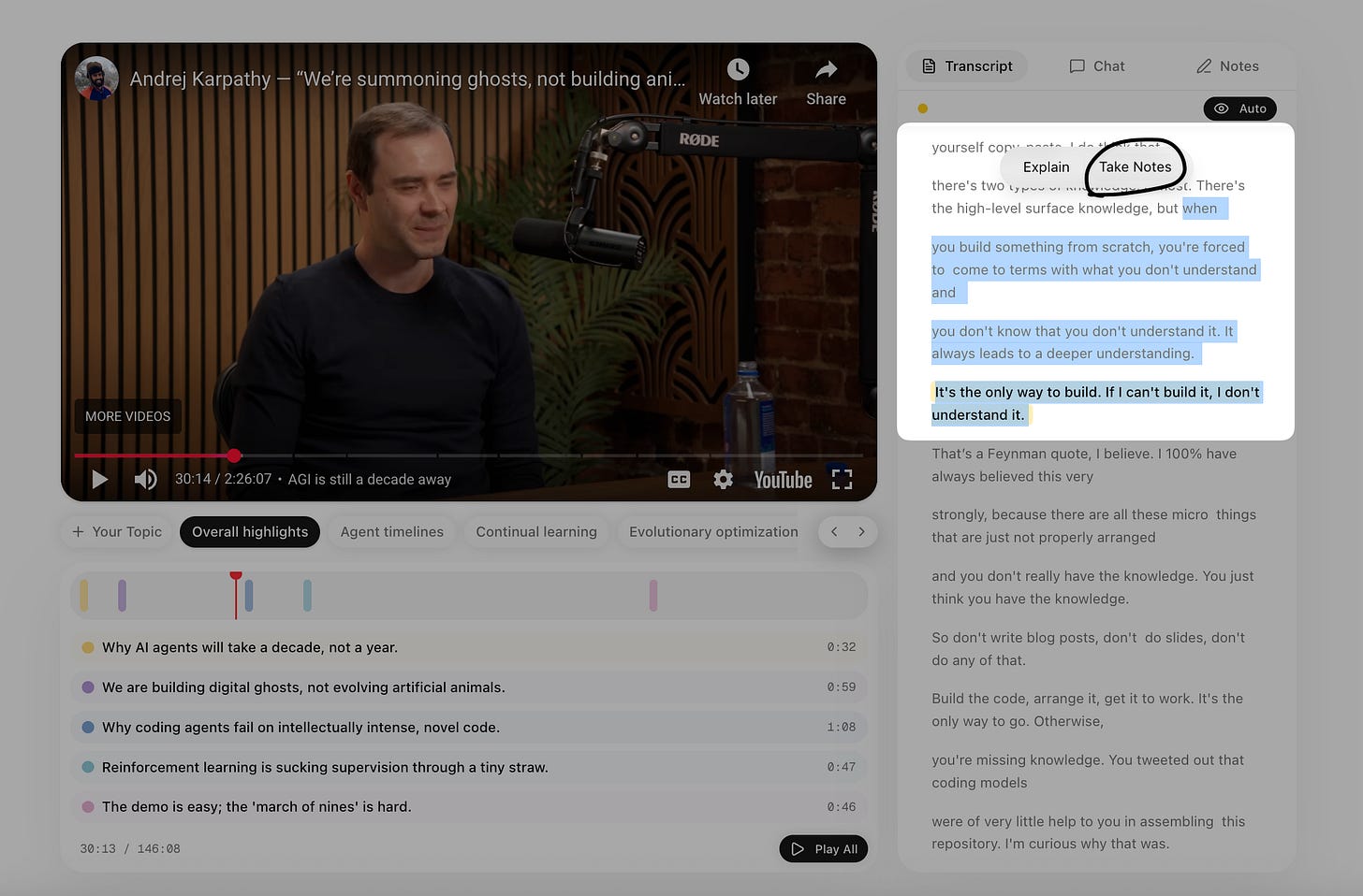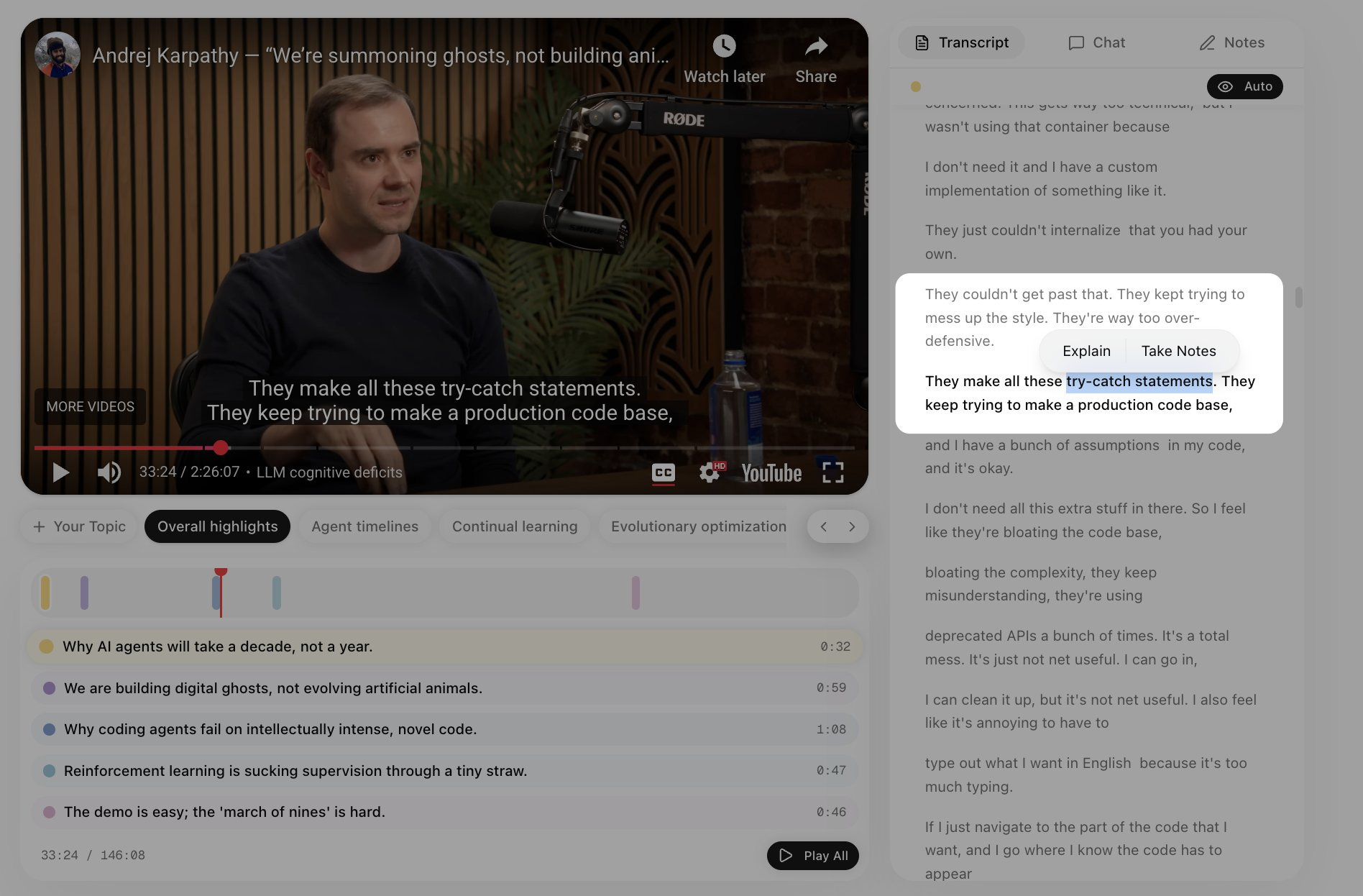 1. When you come across a term/jargon you don’t understand, you can select it in the transcript and click “Explain” - the AI will explain it for you in CONTEXT. The key here is “in context”. Before, I used to manually type out these terms in ChatGPT, but ChatGPT didn’t have the context of what I was watching. The meaning of words/phrases changes depending on the context. Because our AI has the whole video transcript in its context window, it’s able to provide a context-specific explanation in one click.