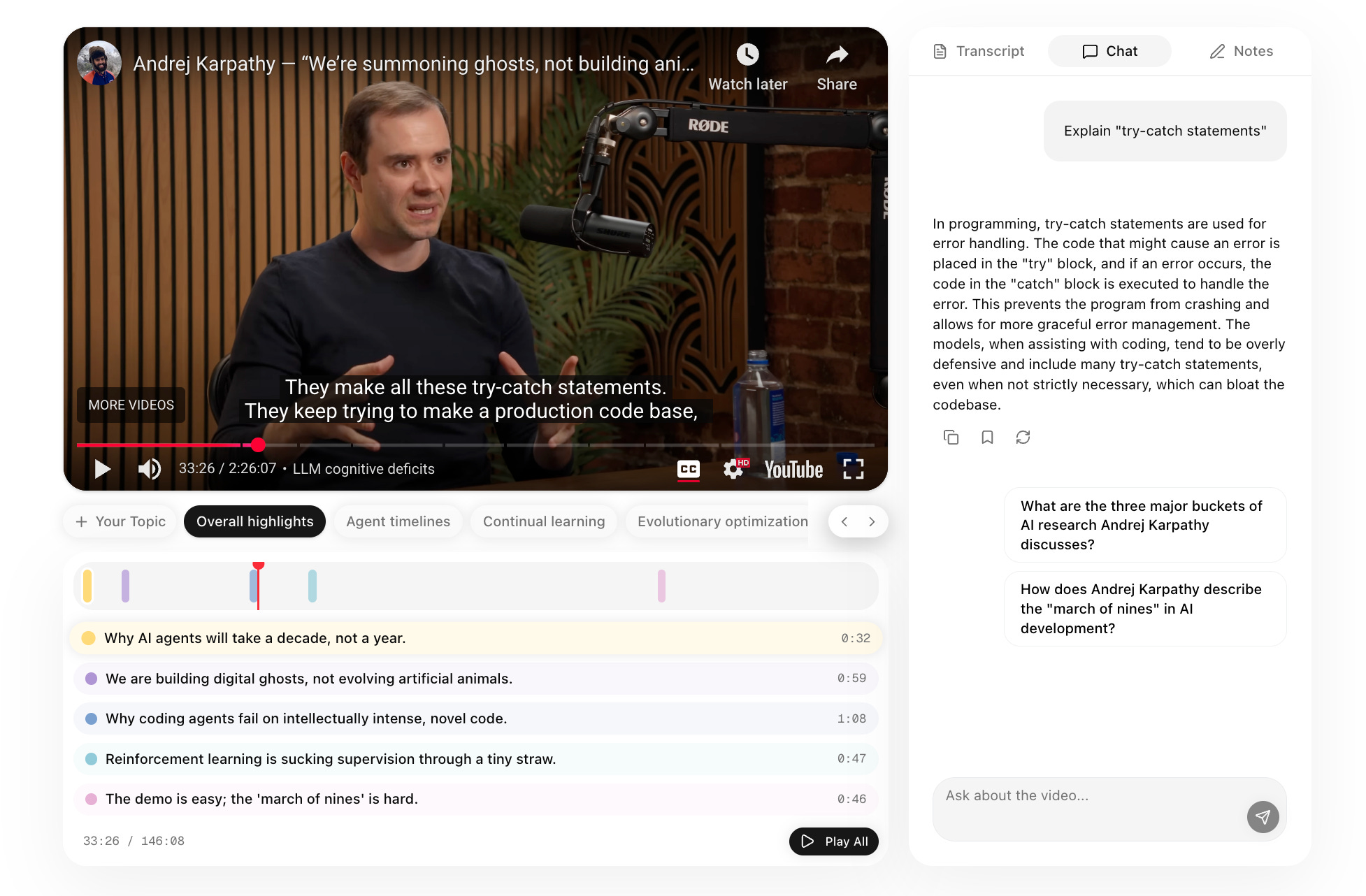 In addition, we also have a few features that addressed my own pain points when trying to watch technical videos to learn AI:
