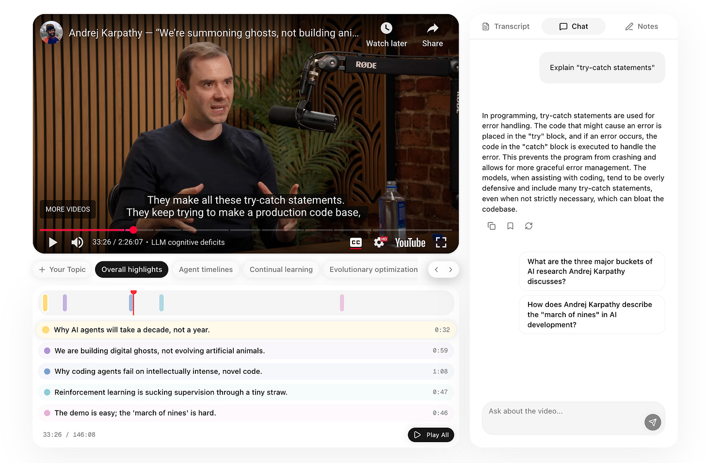 2. Text summaries are generic (unless you put in an extremely detailed prompt specifying what you’re looking for, which 99% of people don’t do). Your summary and my summary will look the same. But given the same hour-long video, we will obviously care about different things. An AI researcher watching a talk by Sam Altman might pay attention to parts about model training, whereas a product manager might be more interested in how models are being productized. Summaries should be personalized.