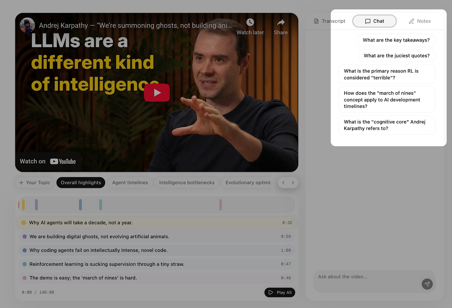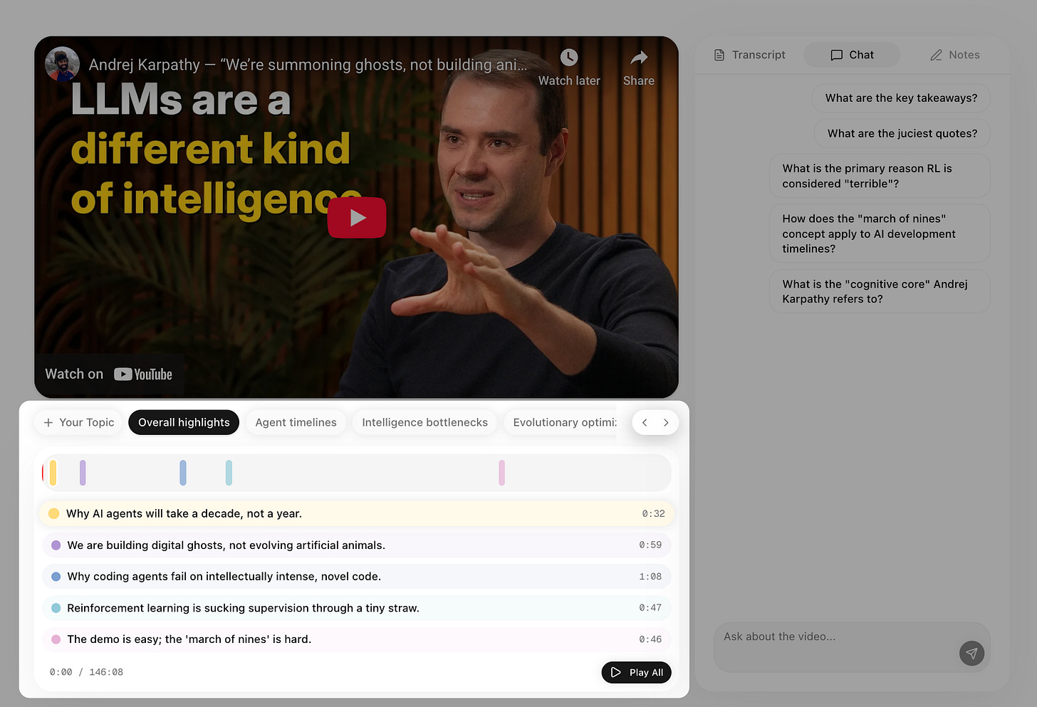 This is what gave rise to TLDW’s key feature: personalized highlight reels. We run the video transcript by an LLM which will identify the most high-signal parts of a video. These “highlight reels” are then displayed using different colors on the progress bar, and clicking on each will take you directly to the corresponding timestamp. And this can be personalized, because different viewers care about different things: Say you’re someone working in education, you could type in “future of education”, and the model will highlight all the parts that discussed education in the video.